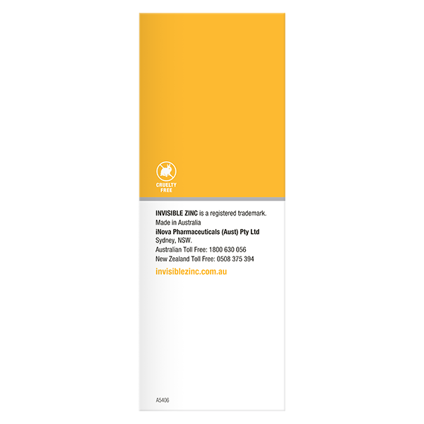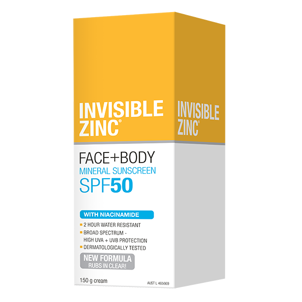 Invisible Zinc Face + Body Mineral Sunscreen SPF50 contains micronised zinc oxide as the only active ingredient providing high broad spectrum UVA + UVB protection, and is 2 hours water resistant.